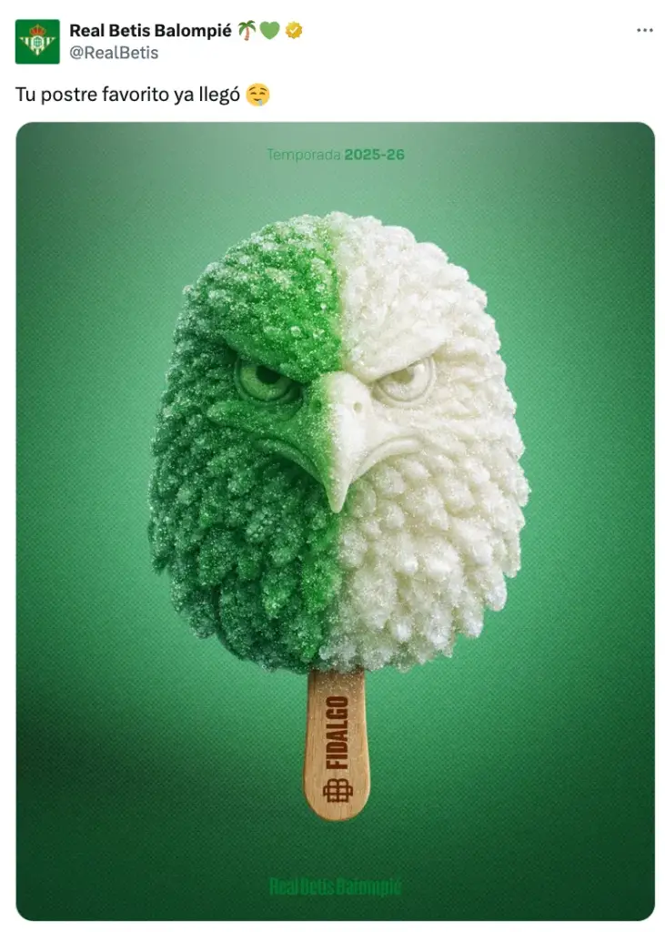 - El Real Betis presentó a Álvaro Fidalgo con una imagen que muestra una paleta en forma de águila con los colores del América y la frase "Tu postre favorito ya llegó".
