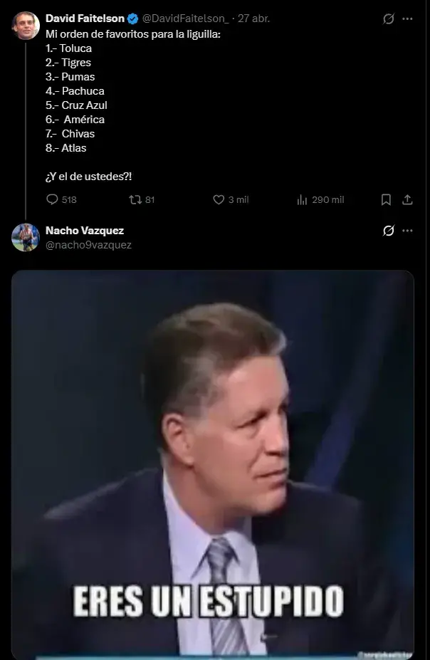 Para expresar su total inconformidad con las palabras de Faitelson, Nacho Vázquez compartió un meme icónico que tiene como protagonista al rostro de Ricardo Peláez. La imagen venía acompañada de la contundente frase: “eres un estúpido”, recordando aquel legendario enfrentamiento que ambos personajes protagonizaron en una mesa de debate de ESPN allá por febrero de 2018.
