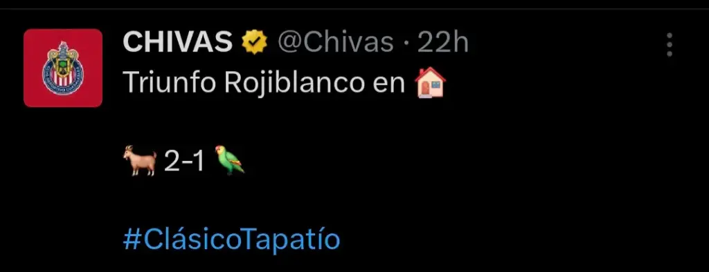 Pero la victoria en el campo no fue lo único que celebró el Club Deportivo Guadalajara. Una vez finalizado el encuentro, el Rebaño Sagrado aprovechó sus redes sociales para lanzar un mensaje que no dejó nada a la imaginación. “Triunfo rojiblanco en casa. Chivas 2-1 Pericos. #ClásicoTapatío”, fue el contundente mensaje que compartió el club, haciendo referencia a la posible venta del Atlas a José Miguel Bejos, dueño de los Pericos de Puebla de la Liga Mexicana de Beisbol (LMB).
