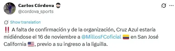 La información proporcionada por el periodista Carlos Córdova sugiere que Cruz Azul podría estar planeando un amistoso en los Estados Unidos contra Millonarios de Bogotá. Esta noticia es muy interesante, ya que podría ser una oportunidad para que el equipo de La Máquina mantenga su ritmo de competencia y no pierda la forma física y táctica. El amistoso, que se llevaría a cabo el 16 de noviembre en San José, California, sería un desafío emocionante para Cruz Azul y podría ser un buen indicador de su preparación para la Liguilla 🏟️.