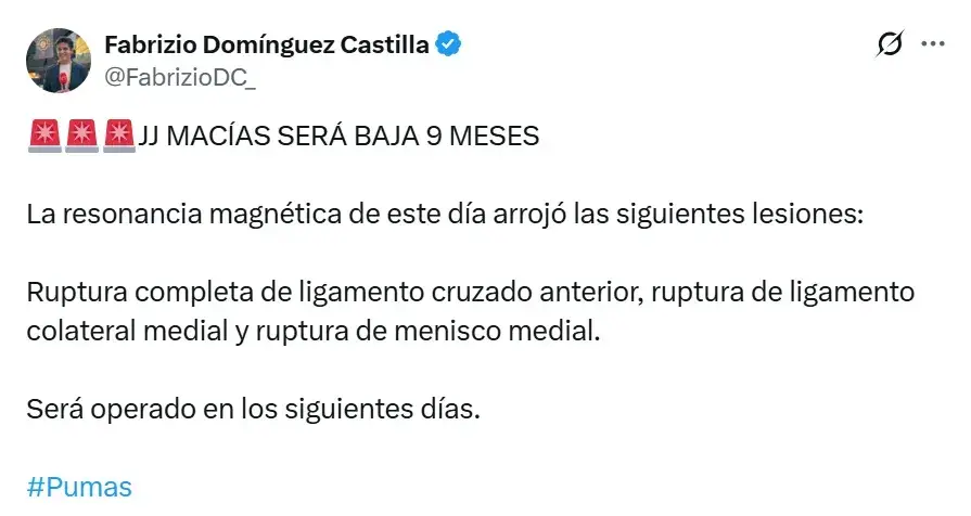 El Pumas venía de un gran partido contra Cruz Azul, donde demostró que puede pelear por un lugar en la Liguilla. Sin embargo, la lesión de Macías llega en el momento menos oportuno, justo cuando el equipo necesitaba de su poder goleador para mantener el ritmo. La recuperación del delantero tomará al menos nueve meses, lo que significa que podría perderse gran parte de la siguiente temporada.